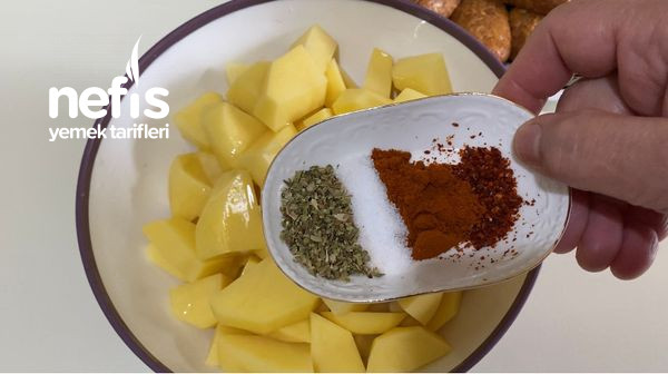 - Patateslerin kabuklarını soyup küp küp doğruyoruz içine baharat ve sıvı yağ ilave edip patatesleri karıştırıyoruz.