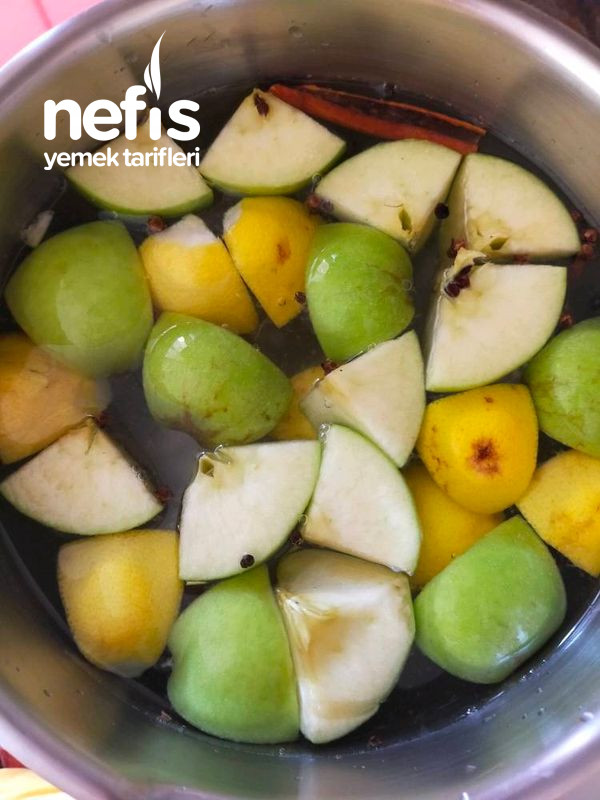 - Limon ve elmalar yıkanır kabuğu soyulmadan önce 4’e sonra 8’e keselim ve tüm malzemeyi bir tencereye alalım suyu da ilave edip kaynatalım.