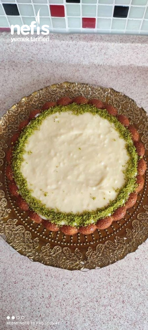 - Kalıbı margarinle yağlayalım sonra kek hamurunu ekleyip 170 derece önceden ısıtılmış fırında pişirilir. Keki kontrol edip piştikten sonra bir servis tabağına ters çevirelim ve ortasına muhallebili karışımı döküp yayalım.