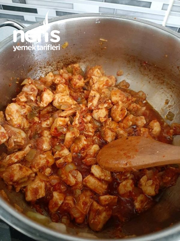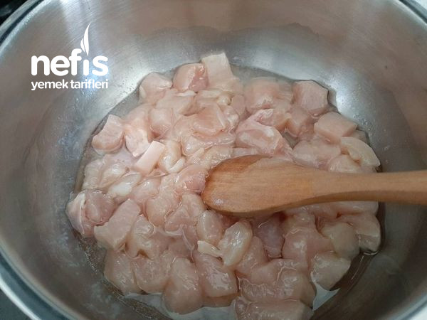 - Tavuğu küp küp doğrayıp haşlayın, suyunu çekince soğanları ve biberleri de küp küp doğrayıp kavurun.