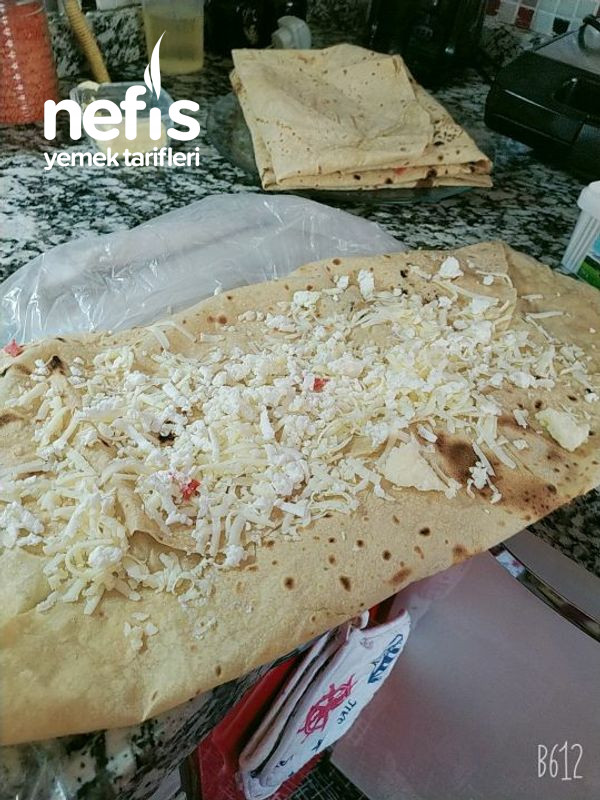 - Yufkayı iki taraftan katlayalım ve arasına peynir ve kaşar peyniri rendeleyin.