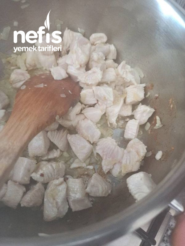 - Küp küp doğranmış tavuk etimizi ekleyip, iyice pişirelim.