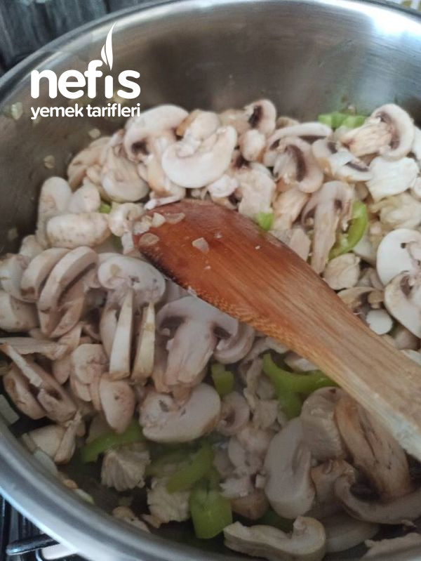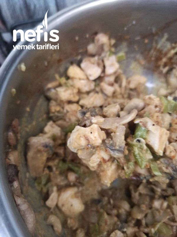 - İnce ince doğradığımız mantar ve biberimizi de ekledikten sonra, baharatlarımızı ilave edelim ve pişen yemeğimizi kenara alıp sosumuzu hazırlayalım.