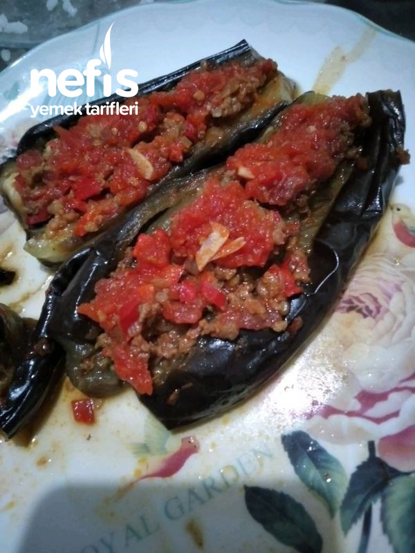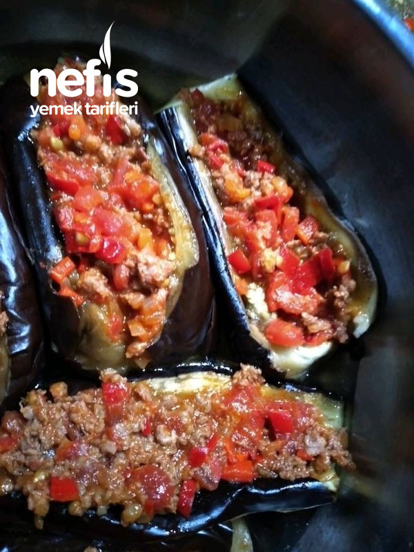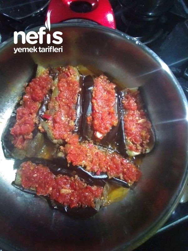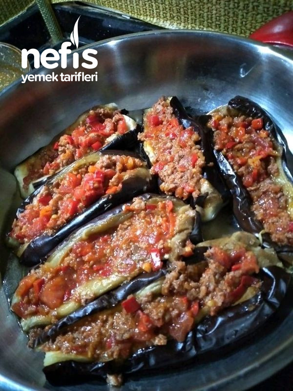 - Daha sonra salçamızı ve etimizi ekleyelim et iyice suyunu bırakması gerekiyor son olarak tuzumu ekleyip karıştırın son olarak tencerenin içine patlıcanları dizip içine harcını koyun patlıcanların üstünü geçmeyecek şekilde su ekleyelim.