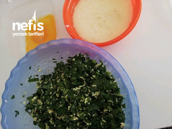 - İç harcı için ıspanakları doğrayıp, peyniri içine rendeliyoruz ve biraz yağ ekleyip baharatlar ekleyip karıştırıyoruz.