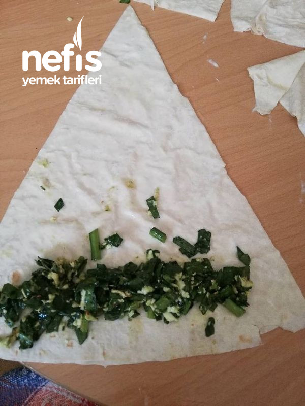 - Daha sonra üç gen şeklinde kesiyoruz ve iç harcımızı koyup sarıyoruz.