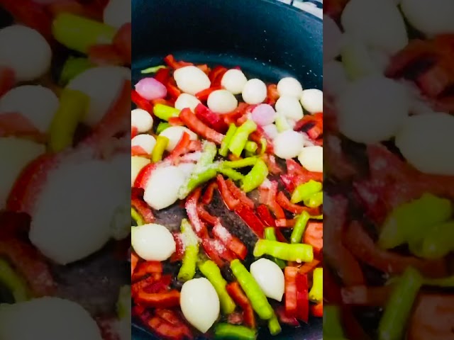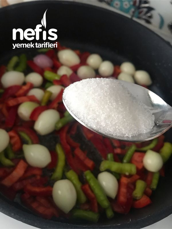 - Arpacık soğanlar ile ince doğranmış biberleri 2-3 dk şekerle beraber soteleyip tavukları ilave ediyoruz.