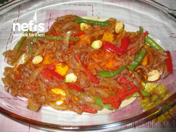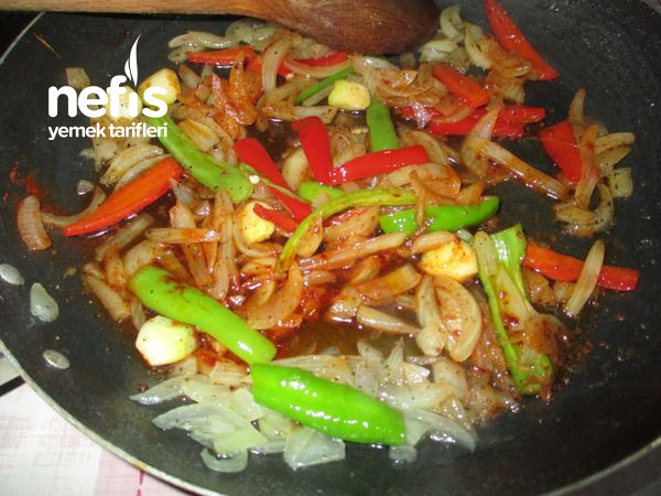 - Sonra tavaya yağları koyalım, soğanı sarımsağı biberleri koyalım, kısık ateşte 10 dakika pişirelim tuz ve baharatları serpip karıştıralım ocağı kapatalım.