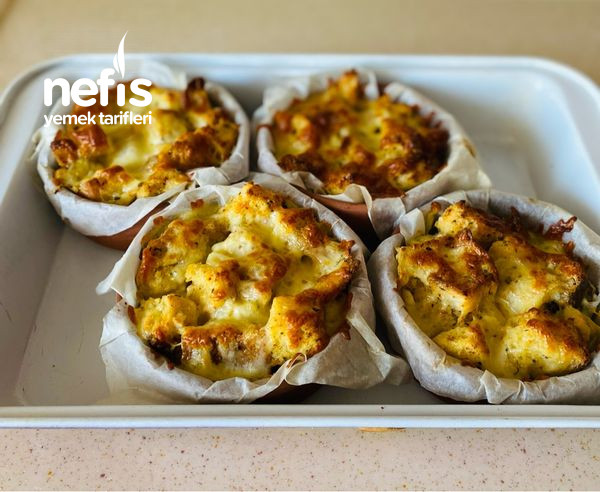 - Yağlı kağıdı 4 böldüm güveçlere yaydım ve ekmekleri pay ettim üzerlerine 1 er tatlı kaşığı tereyağı ilave ettim ve rende kaşar serptim.