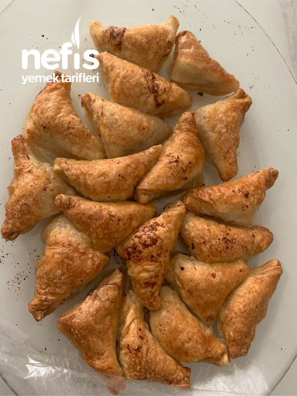 3. 6 adet milföyü 4 er eşit parçaya keselim ve her birinin içine önce ceviz, fındık içlerinden sonrada irmikli harçtan koyup üçgen şeklinde kapatalım.