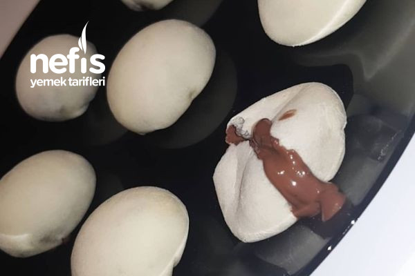 - Parça parça bölüp yuvarlak şekilde merdane ile açın ve üzerine tam ortasına çikolatayı sürün.