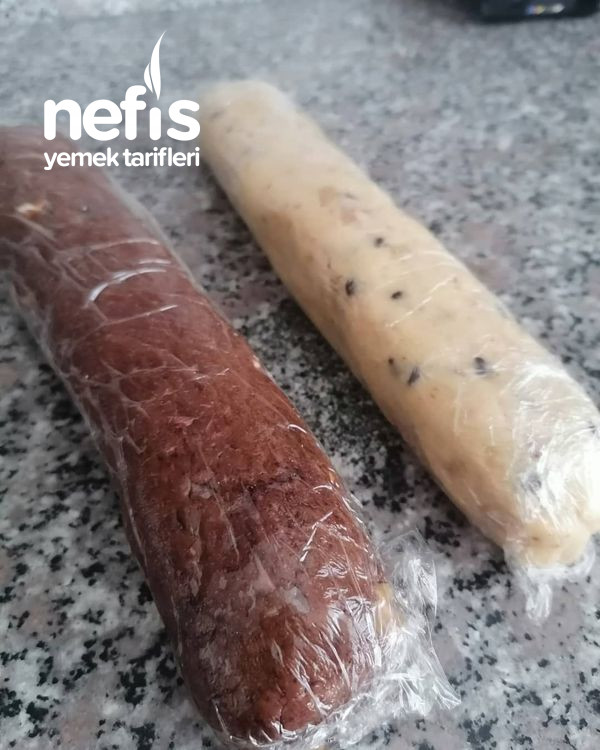 - Sonra hamur ikiye bölüp yarısına kakao ekleyip elde ettiğiniz hamura kalıp verip yağlı kağıda sarın .