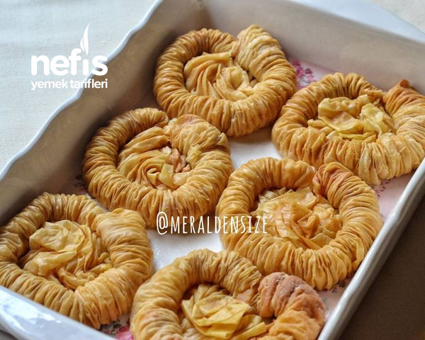 - Kestiğimiz yufka oklavaya sarılır ve içe doğru büzülüp oklavadan çıkarılıp yuvarlak şekilde birleştirilir ve tepsiye dizilir.