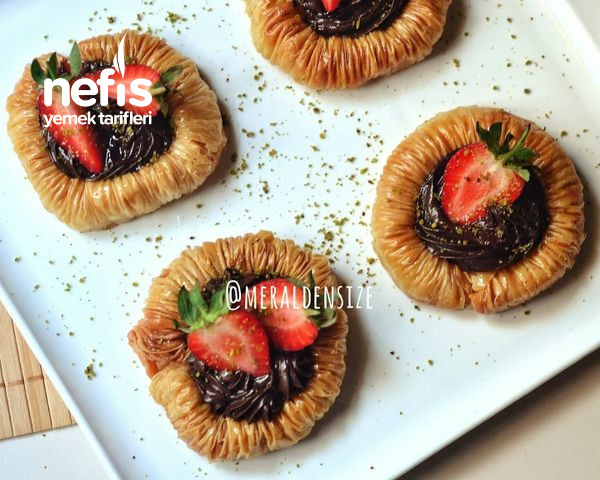 - Şerbetlenen tatlı üzerine sürme çikolata konup çilek ile süslenir. Ben biraz da fıstık serptim. Çıtır çıtır çok pratik tatlımız hazır. Afiyet olsun.