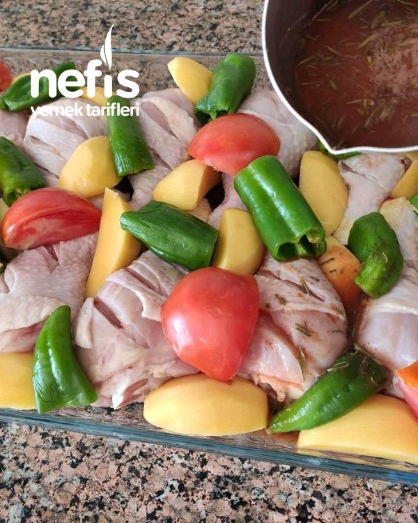 - Sosu için sıcak suyun içinde salçayı eritin, sıvı yağ, tuz ve baharatları ilave edin karıştırın, tavukların ve sebzelerin üzerine gezdirin.