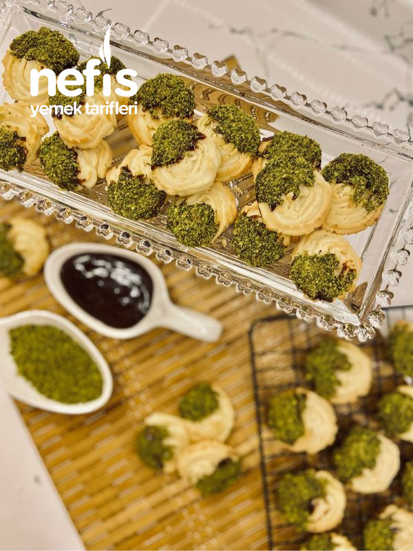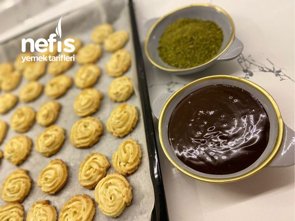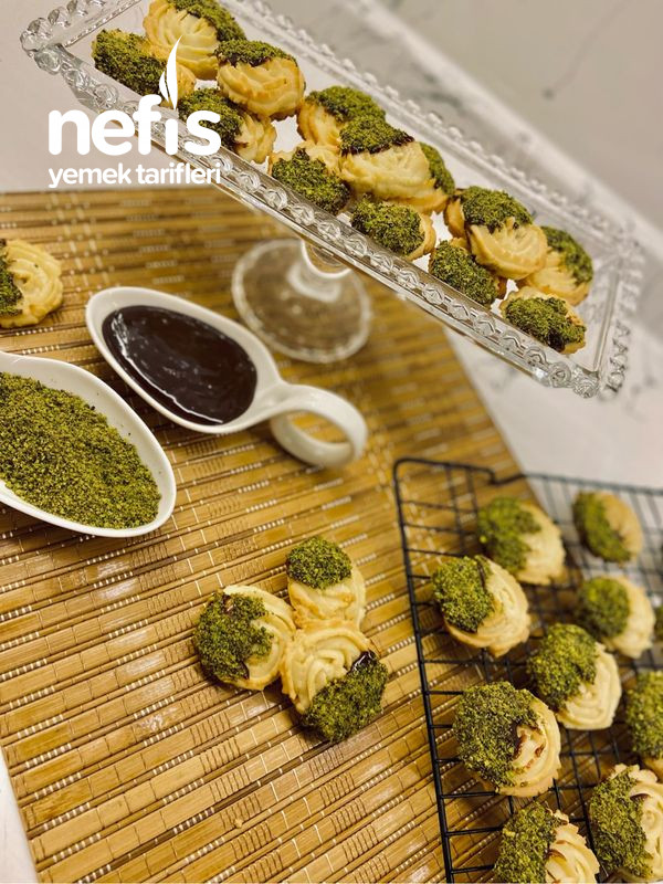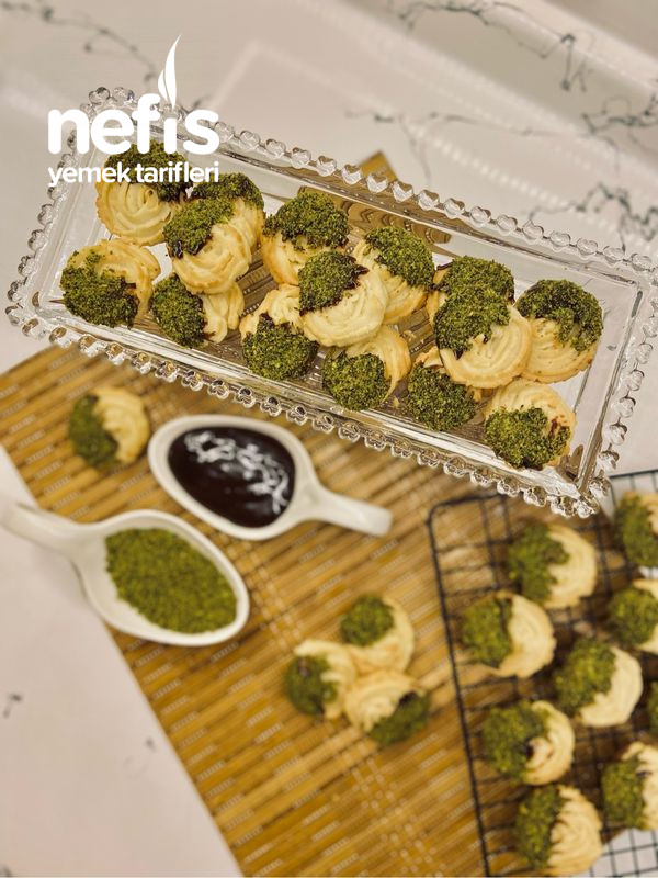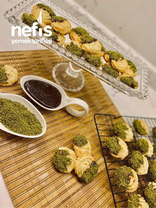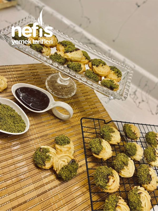 - Pişen kurabiyelerimiz tamamen soğuduktan sonra benmari usulü eritilmiş çikolataya ucunu batırıp ardından fıstığa batırıyoruz. Çok lezzetli ve kıyır kıyır olan bu tarifimi mutlaka denemelisiniz ???? şimdiden deneyen herkese afiyet olsun.