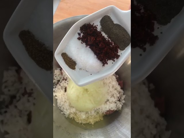 - Köftelerimizi hazırlamak için karıştırma kabına şişen pirinçlerle beraber kalan malzemeleri ekleyip güzelce karıştırıp yoğuralım.