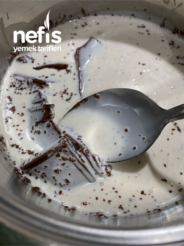 - Çikolata sosu için; bir buçuk paket kremayı tencereye alıyoruz kenarlardan kaynamaya başlayınca altını kapatıp çikolatasını ilave edip eritiyoruz.