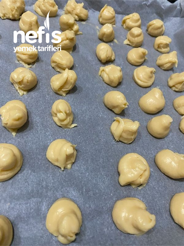 - Hamuru için; tencereye su ve tereyağı alıp eriyene kadar karıştırıyoruz unu ilave edip pişiriyoruz iyice soğuyunca yumurtaları tek tek kırıp çırpıyoruz sıkma torbasına yada kaşık yardımıyla yağlı kağıt serili tepsiye aralıklarla sıkıyoruz.