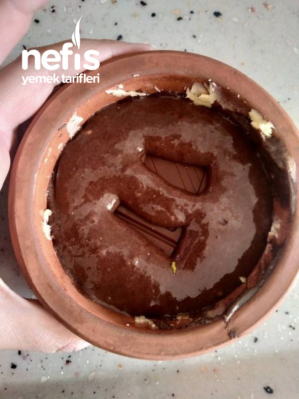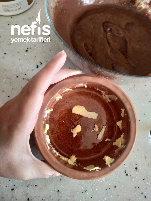 - Hazırlanan karışımdan bir kepçe kaba alınır ortasına bitter çikolata bırakılır tekrar karışımdan çikolatanın üstü kapatılır.Kabın yarısına gelmiş olmalı.