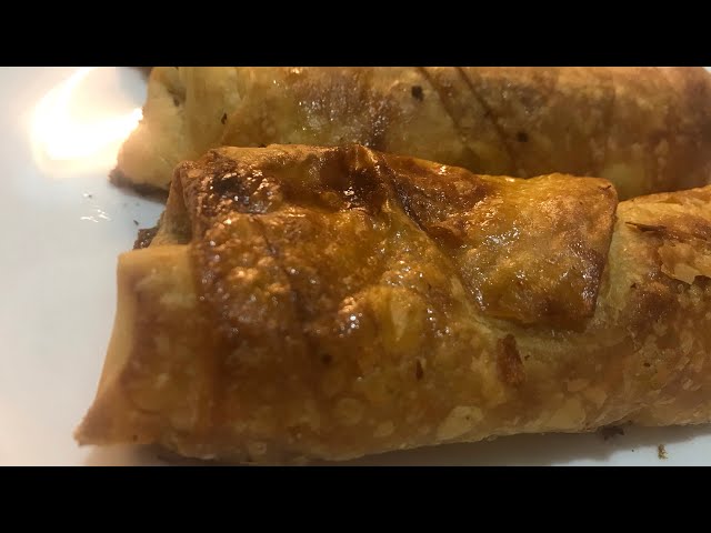 10. Üçgen yufkamızın ilk katına sıvı harcımızdan birazcık döküp 2. Üçgenimizi üstüne serip iç harcımızdan koyup bol şekilde sarıyoruz.