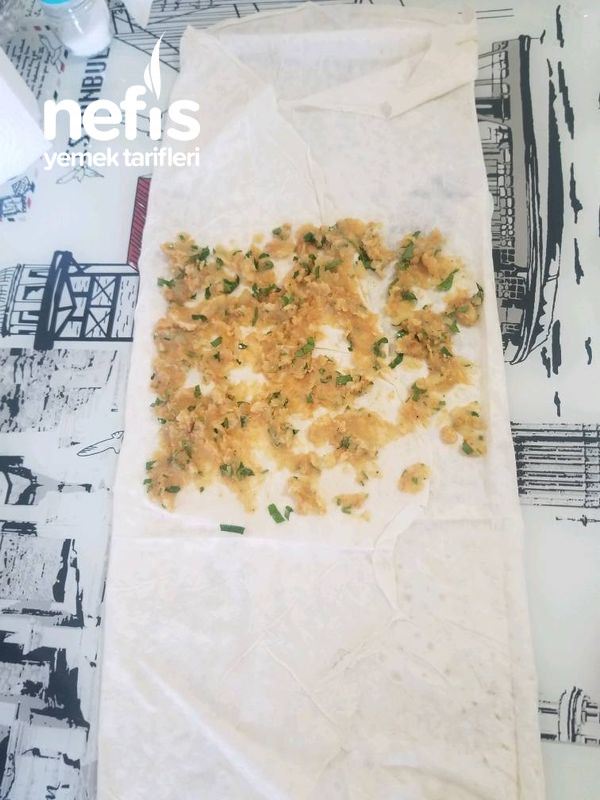 4. 1 yufka alıp masaya serelim içine peynirli veya patatesli harçtan koyup katlayalım.