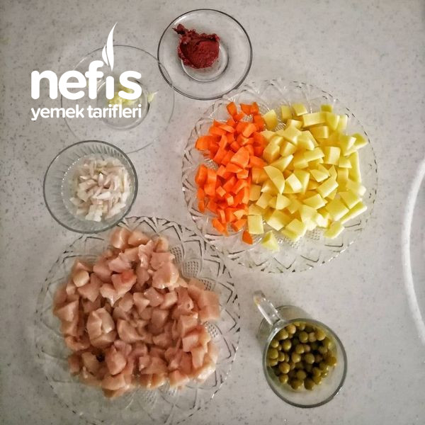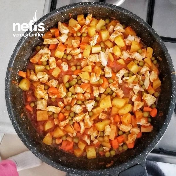 - 2 dakika bu şekilde pişirip salçayı ilave edin salçanın kokusu çıkınca 1 su bardağı su, bezelye, tuz ve karabiberini ilave edip kapağını kapatın havuç ve patatesler pişene kadar kısık ateşte pişirin.