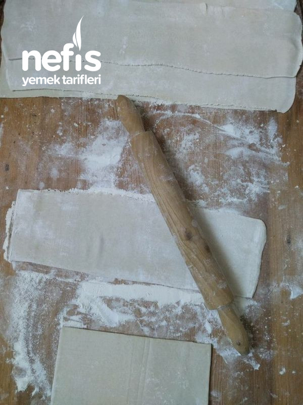 - Buzu çözülmüş milföyleri uzunlamasına merdane ile hafif un serpip açın.