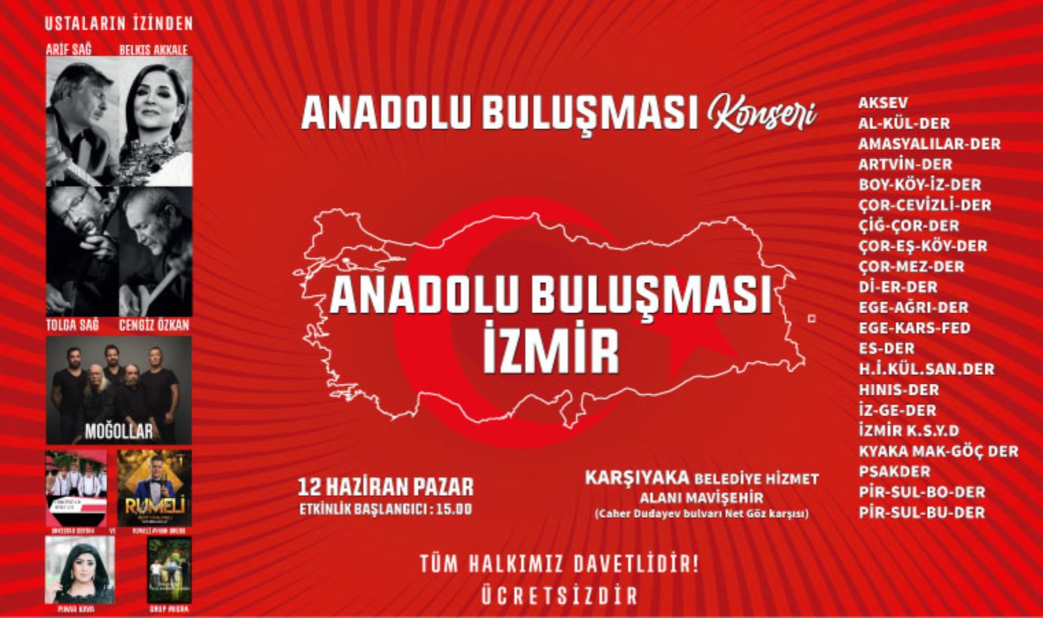 Karşıyaka Mavişehir’de bulunan Karşıyaka Belediyesi Hizmet Alanı’nda düzenlenecek aktiflikte, halk müziğinin ustaları sahne alacak. Gecede Türk rock müziğinin efsane kümesi Moğollar ile usta sanatkarlar Arif Sağ, Belkıs Akkale, Tolga Sağ, Cengiz Özkan, Pınar Kaya, Aziz Karaca, Rumeli Ayhan ve Orkestra Sertan, Anadolu ezgilerini müzikseverlerle buluşturacak.