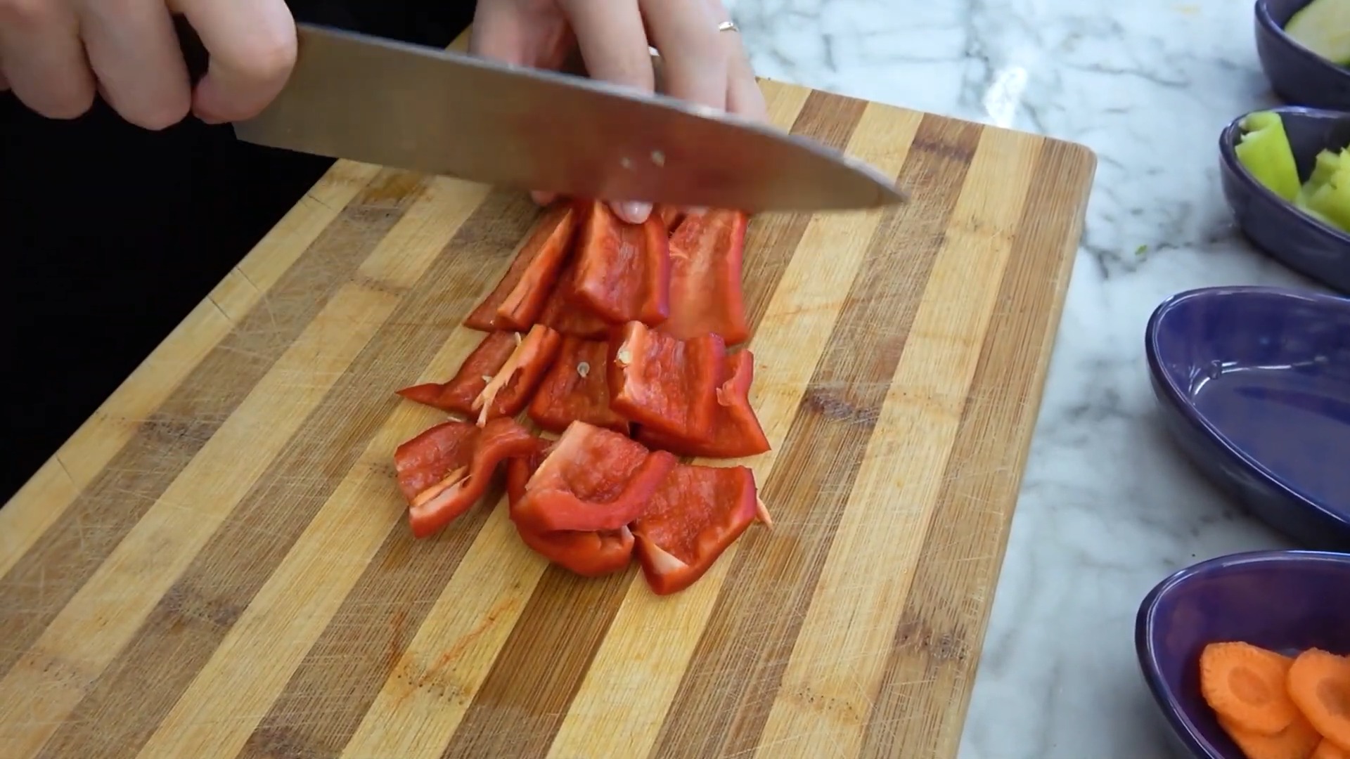 - Biberleri ikiye bölün ve kare şeklinde doğrayın.