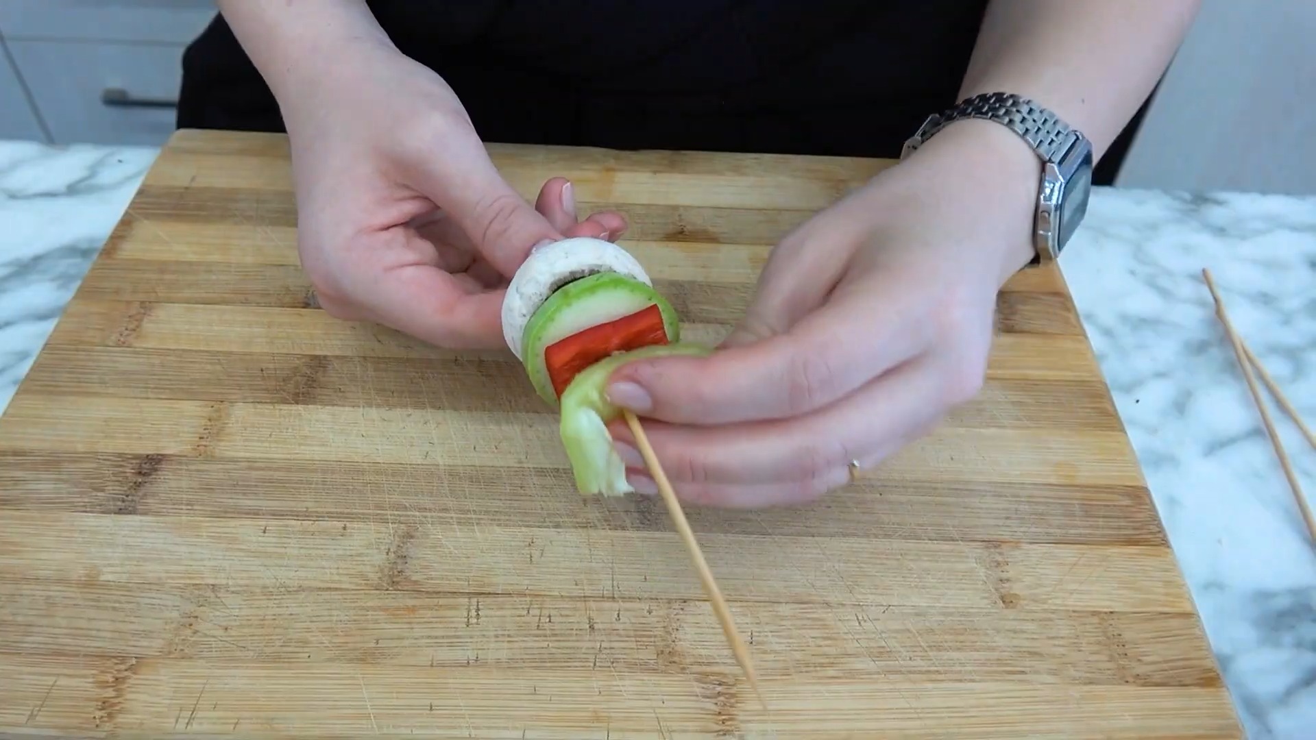 - Sebzeleri sırayla tahta şişlere geçirin.
