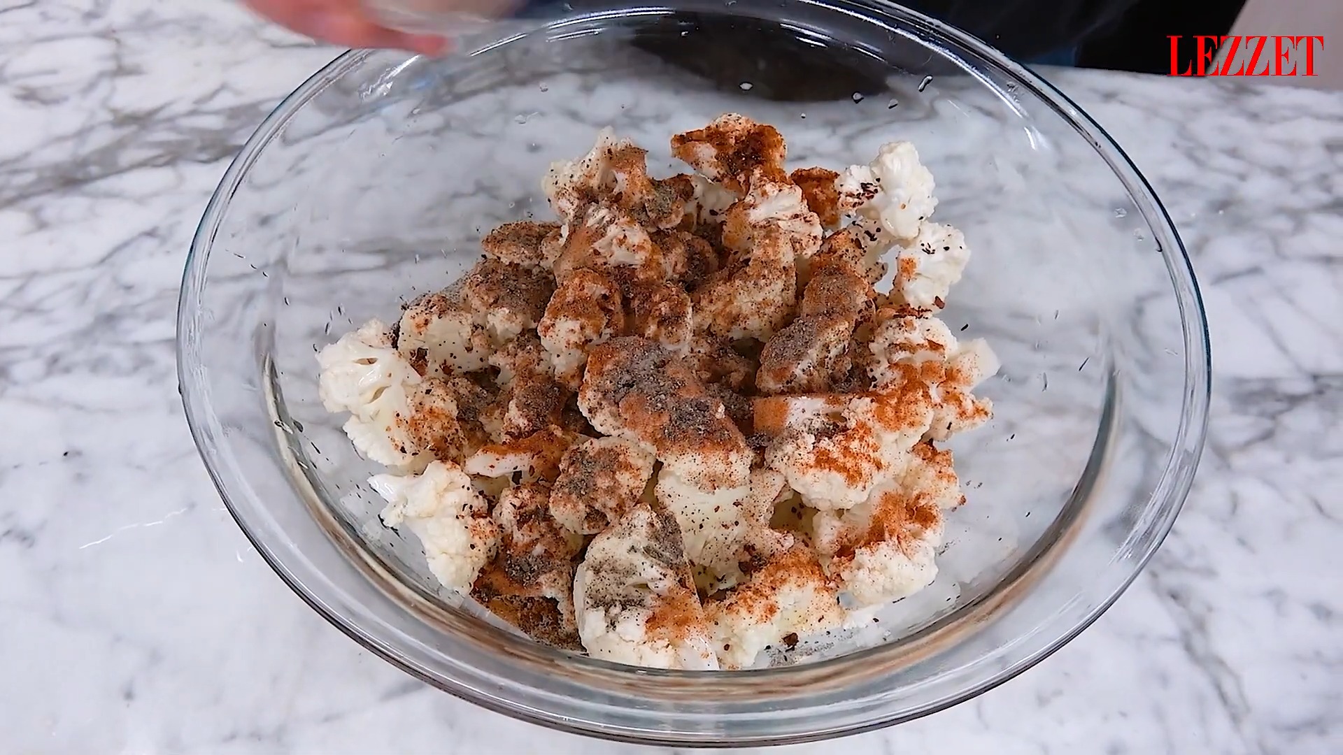 - Kaseye aldığınız karnabaharın üzerine zeytinyağı ve baharatları ekleyerek güzelce karıştırın.
