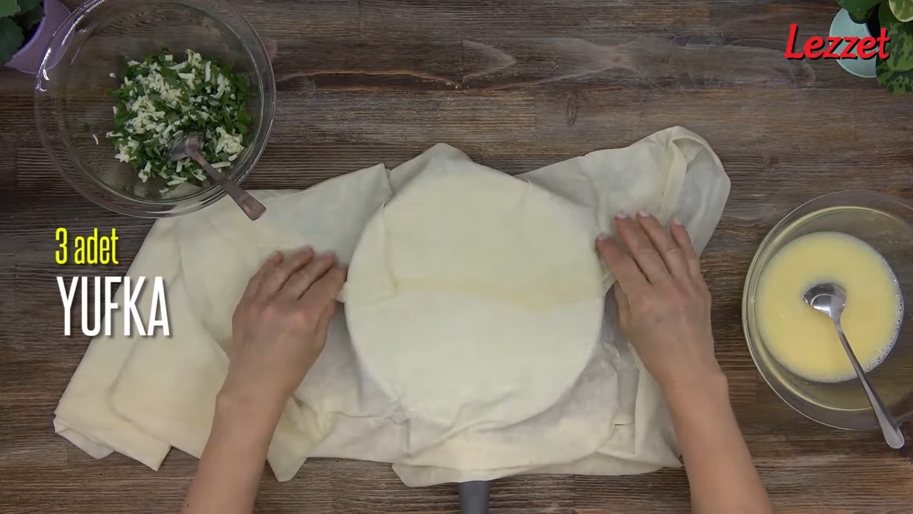 - Derin bir kaba süt, sıvı yağ, yumurta koyup iyice çırpın ve tavaya serdiğiniz yufkanın üstüne 4-5 yemek kaşığı bu karışımdan sürün.