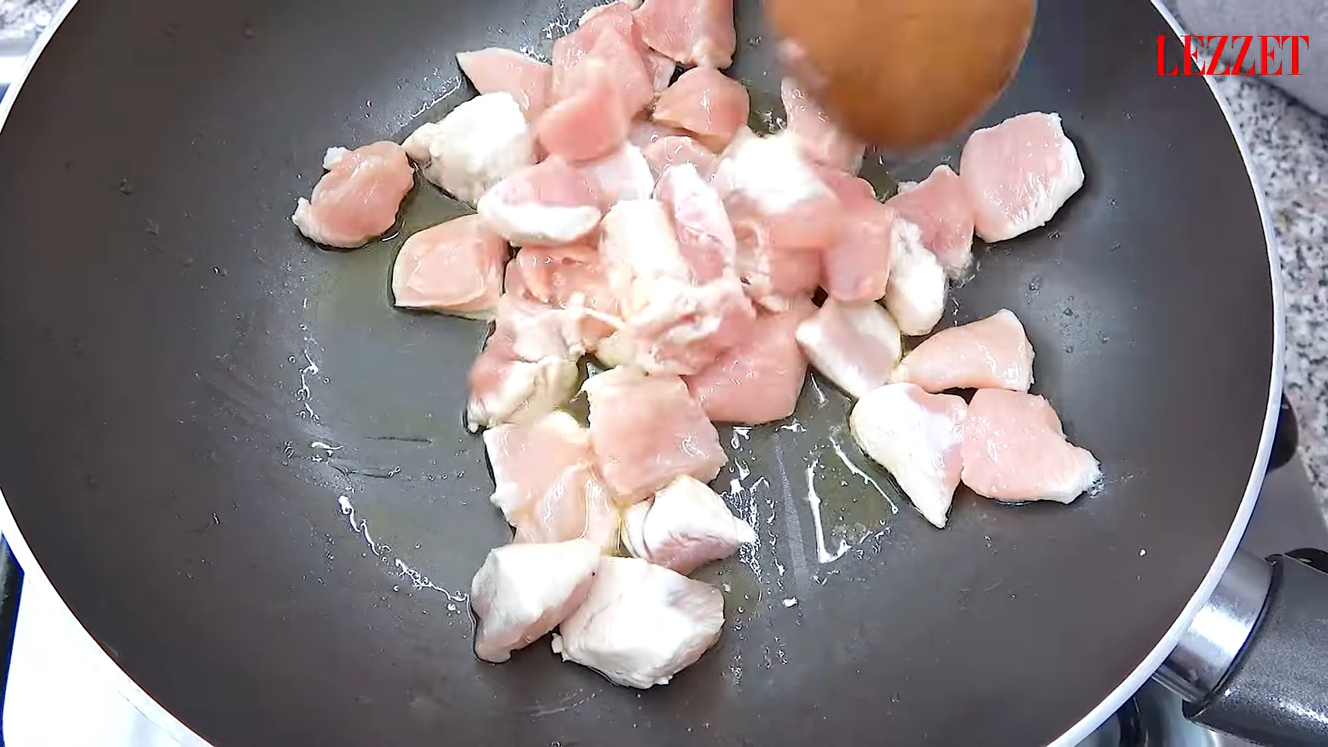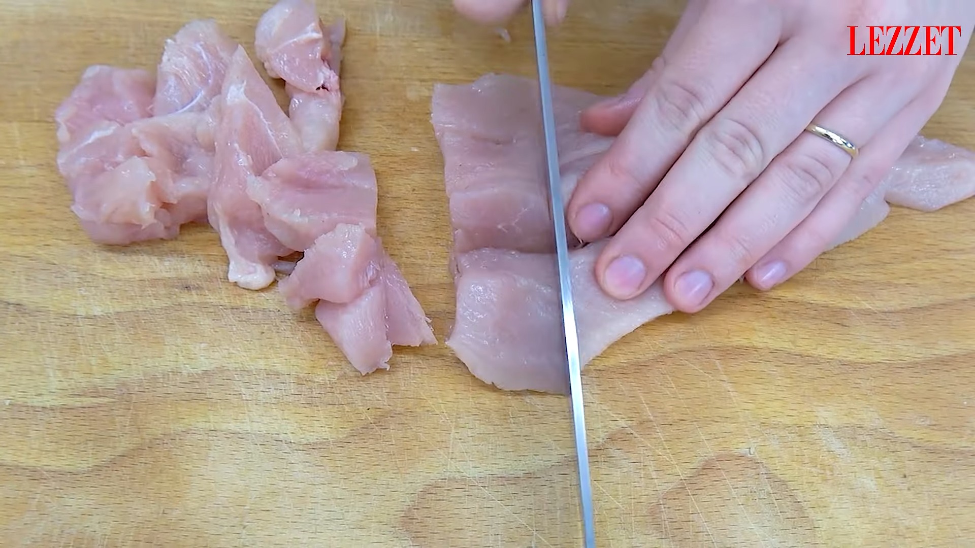 - Öncelikle tavuk göğsünü kuşbaşı şeklinde doğrayın.