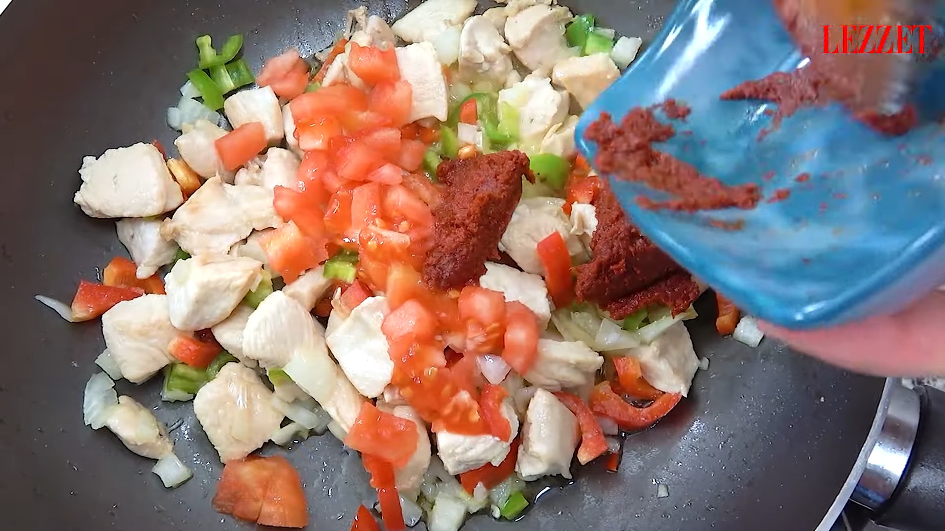 - Üzerine küp küp doğranmış domates ve salçayı ilave edin. Suyunu çekene kadar karıştırın.