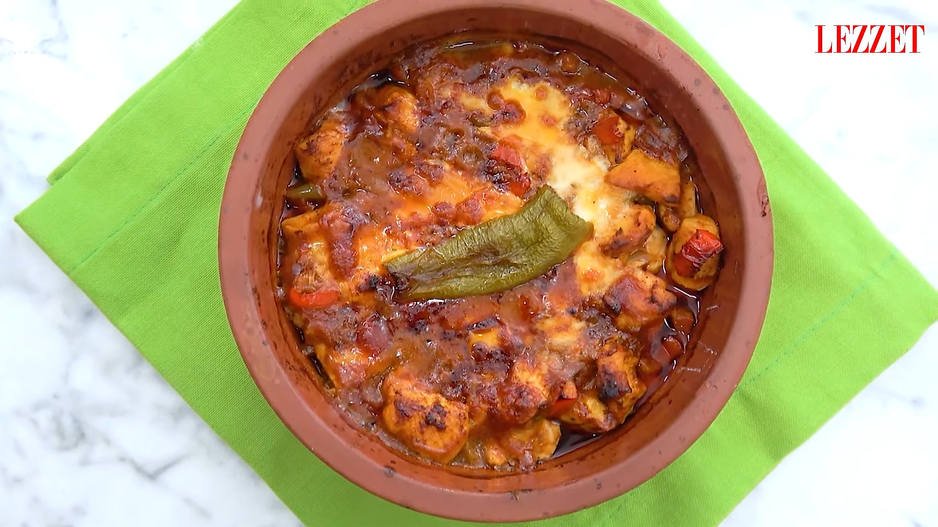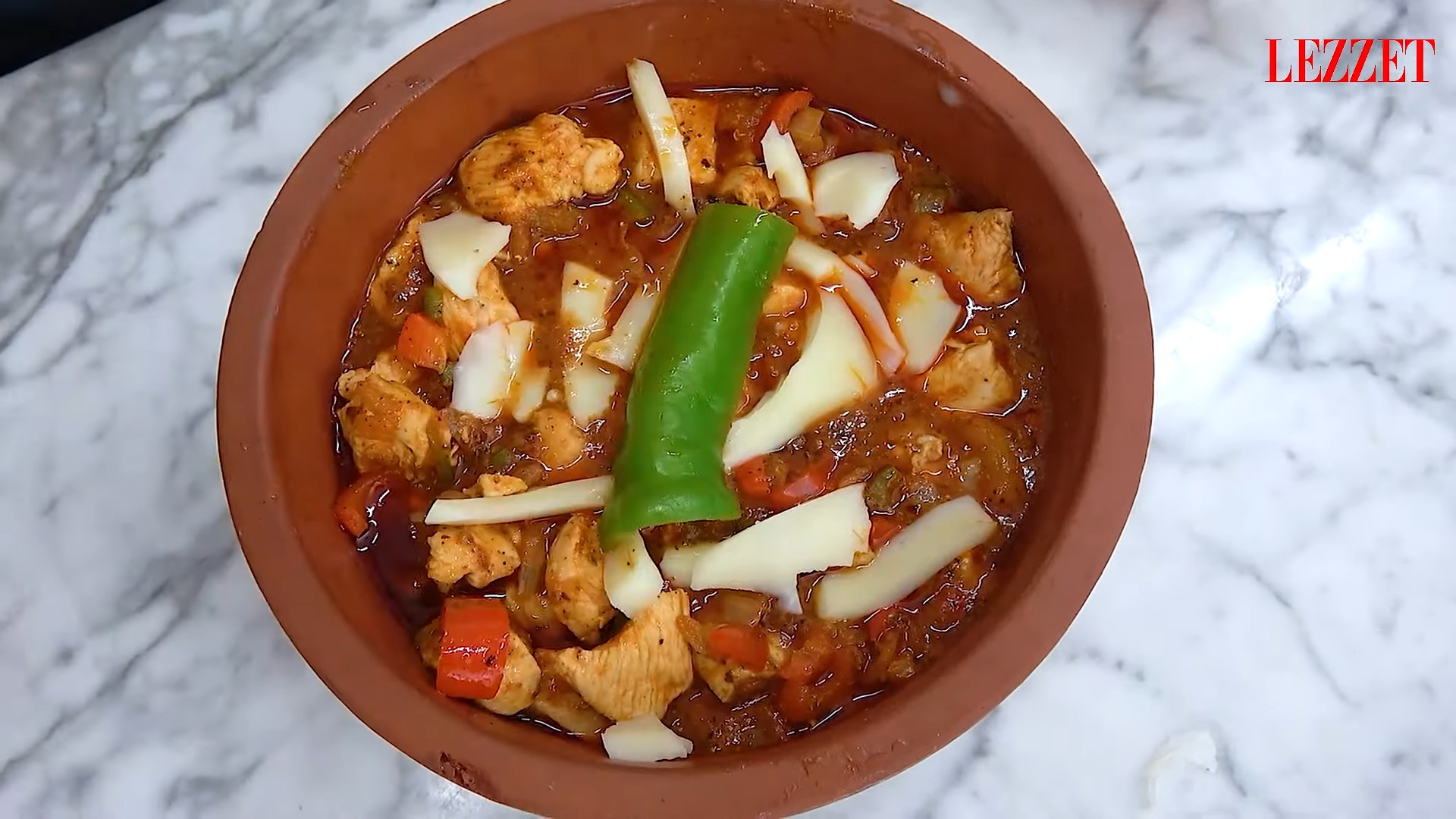 - Tavuk piştiğinde üzerine az miktarda su ekleyin ve karıştırın. Hazırladığınız yemeği güveç kabına alın. Üzerine kaşar peyniri ve biber ekleyerek önceden ısıtılmış 180 dereceli fırında üzeri kızarana kadar pişirin.