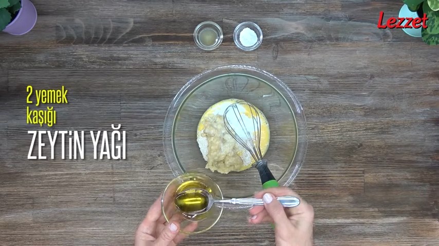- Ardından yulaf ezmesi, muz, süt, zeytinyağı, karbonat ve bir-iki damla limon suyunu iyice çırptığınız yumurtanın bulunduğu kaba ilave edin.