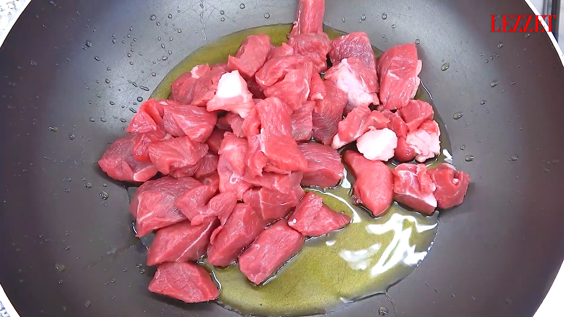 - Geniş bir tavaya zeytinyağını alın ve ısıtın. Isınan yağa kuşbaşı etleri ekleyin ve rengi değişene kadar karıştırın.