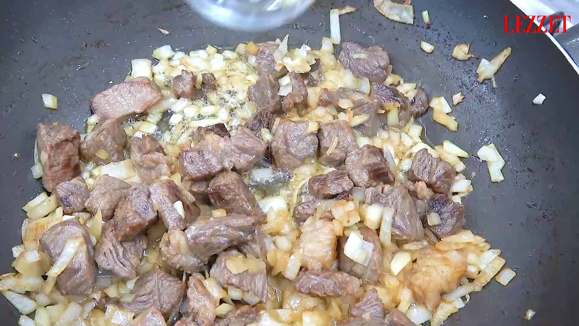 - Etlerin üzerine soğan ve sarımsağı ekleyin.