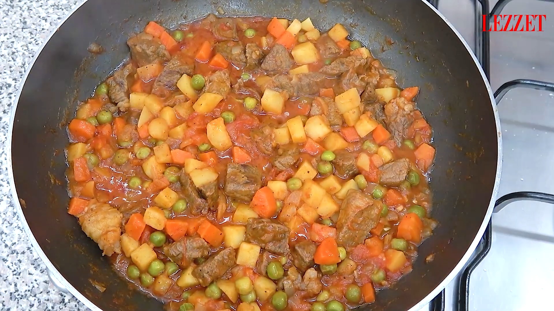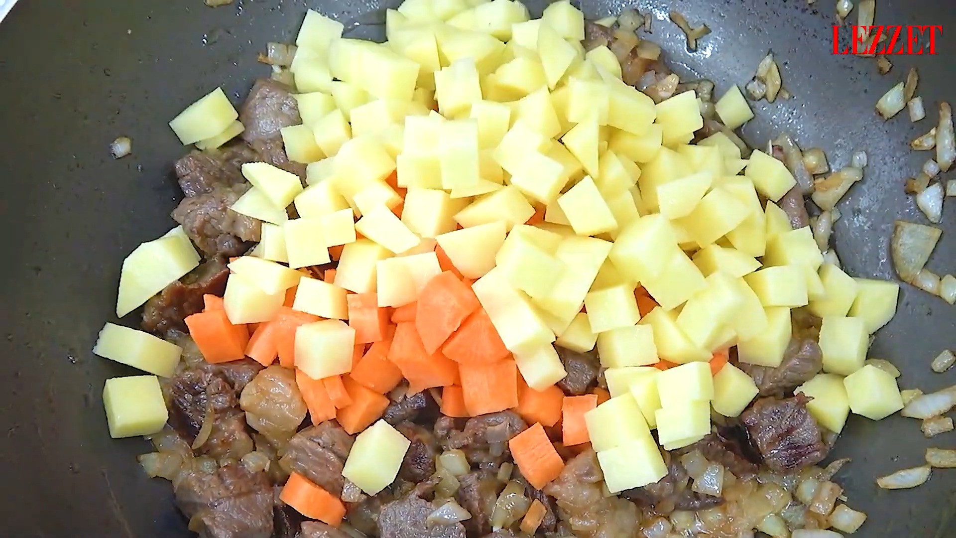 - Daha sonra patates ve havuçları ekleyin ve birkaç kez karıştırın.