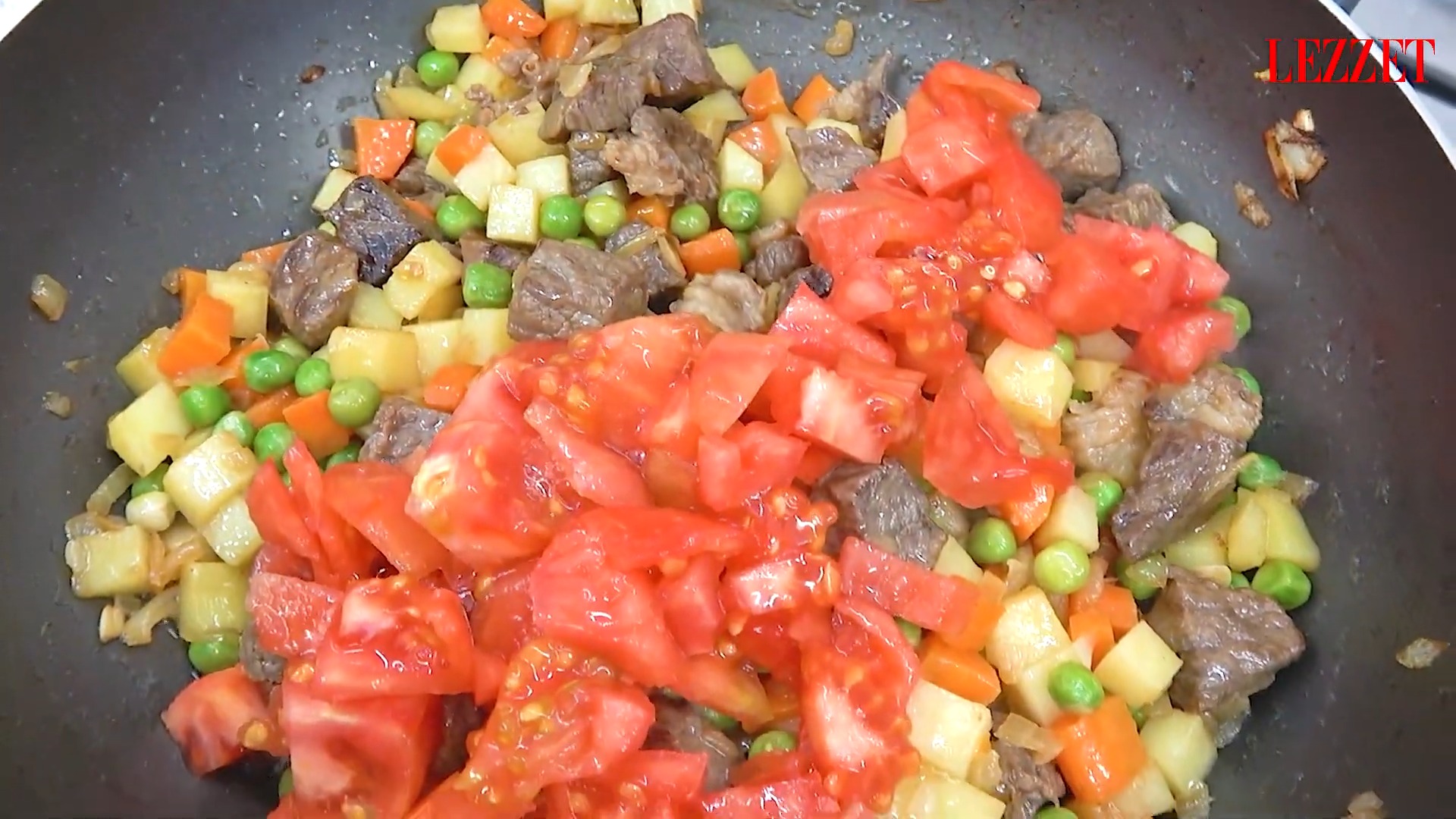 - Bezelye ve domatesleri ilave edin. Salçayı ekleyerek hafifçe karıştırın.