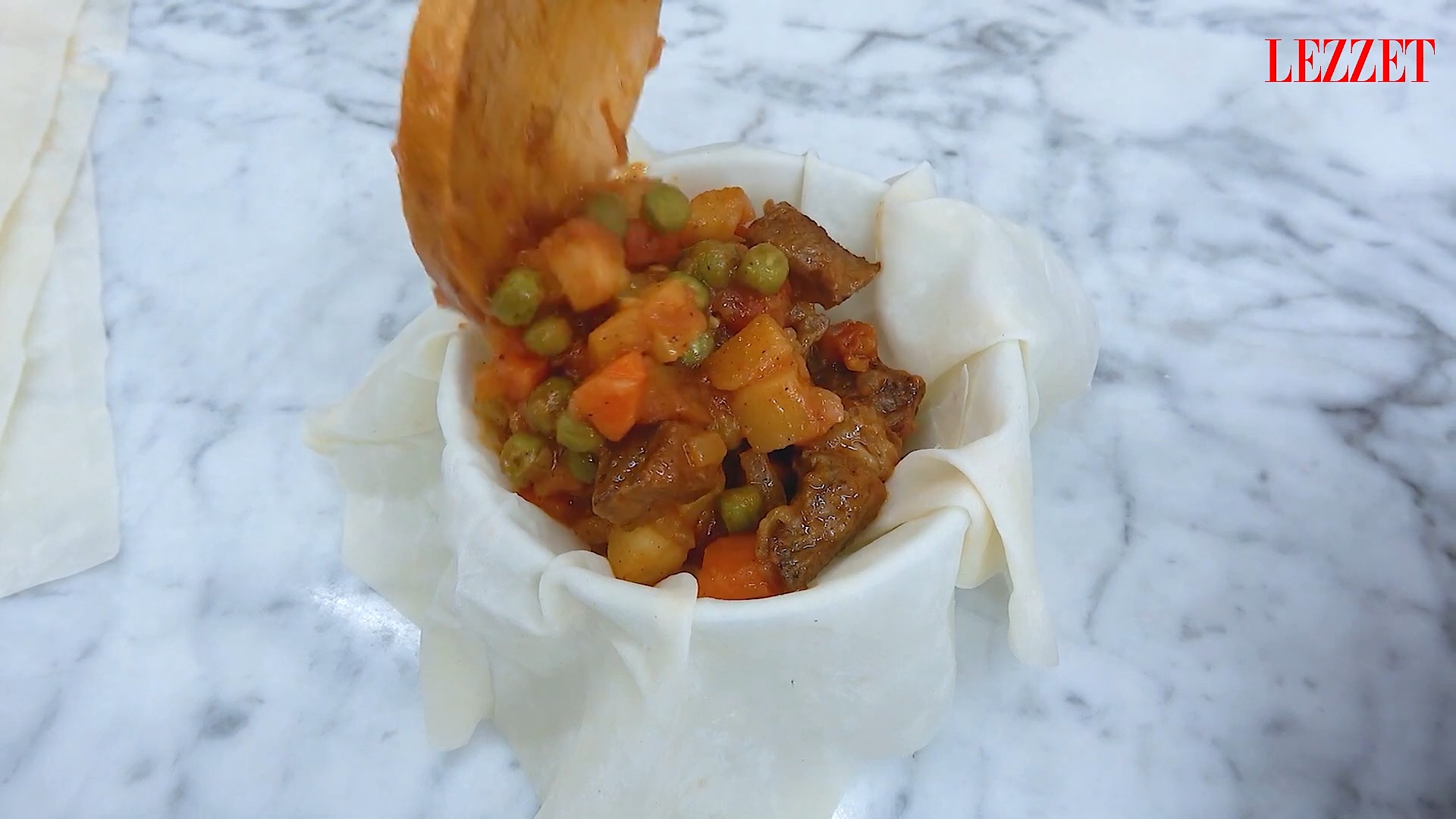- Bu esnada yufkaları dört parçaya bölün. Böldüğünüz parçayı kasenin içine yerleştirin. Üzerine etli karışımdan ekleyin ve yufkanın kenarlarından kapatarak bohça şekli verin.