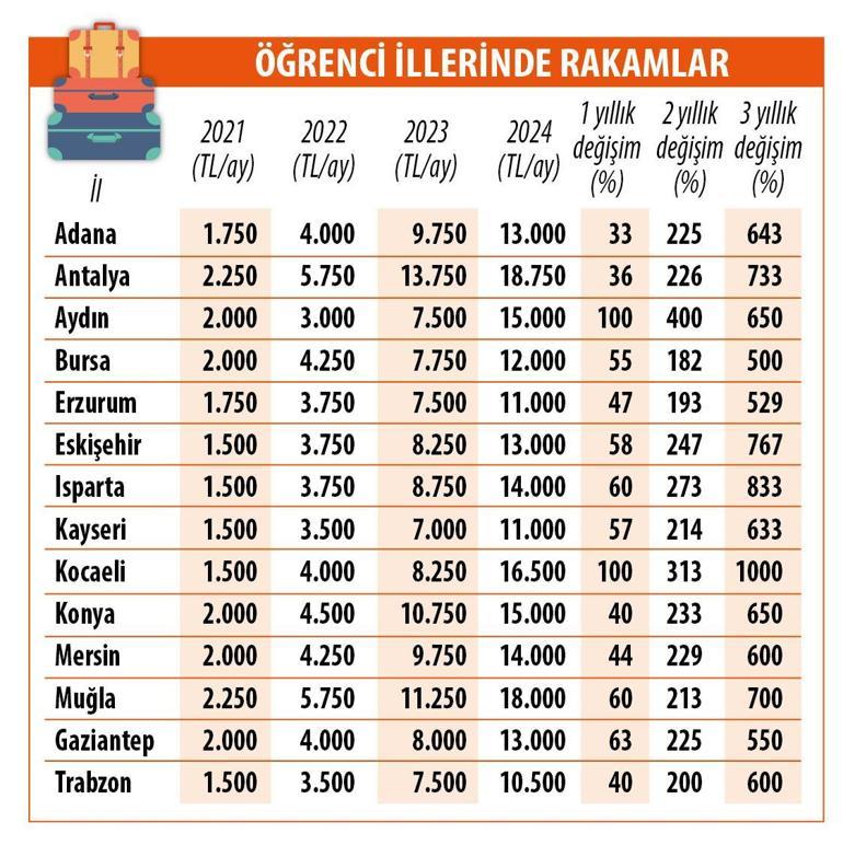 Ülke genelinde üç büyük ilin haricinde öğrenci kenti olarak Eskişehir, Konya, Bursa, Kocaeli ve Kayseri ön plana çıkıyor. Araştırmada incelenen 14 ile bakıldığında 10 bin TL’nin altında konut kirasının olmadığı, kiraların 18 bin 750 TL’ye kadar yükselebildiği ve öğrenciler için barınma maliyetinin epey artış gösterdiği görülüyor.