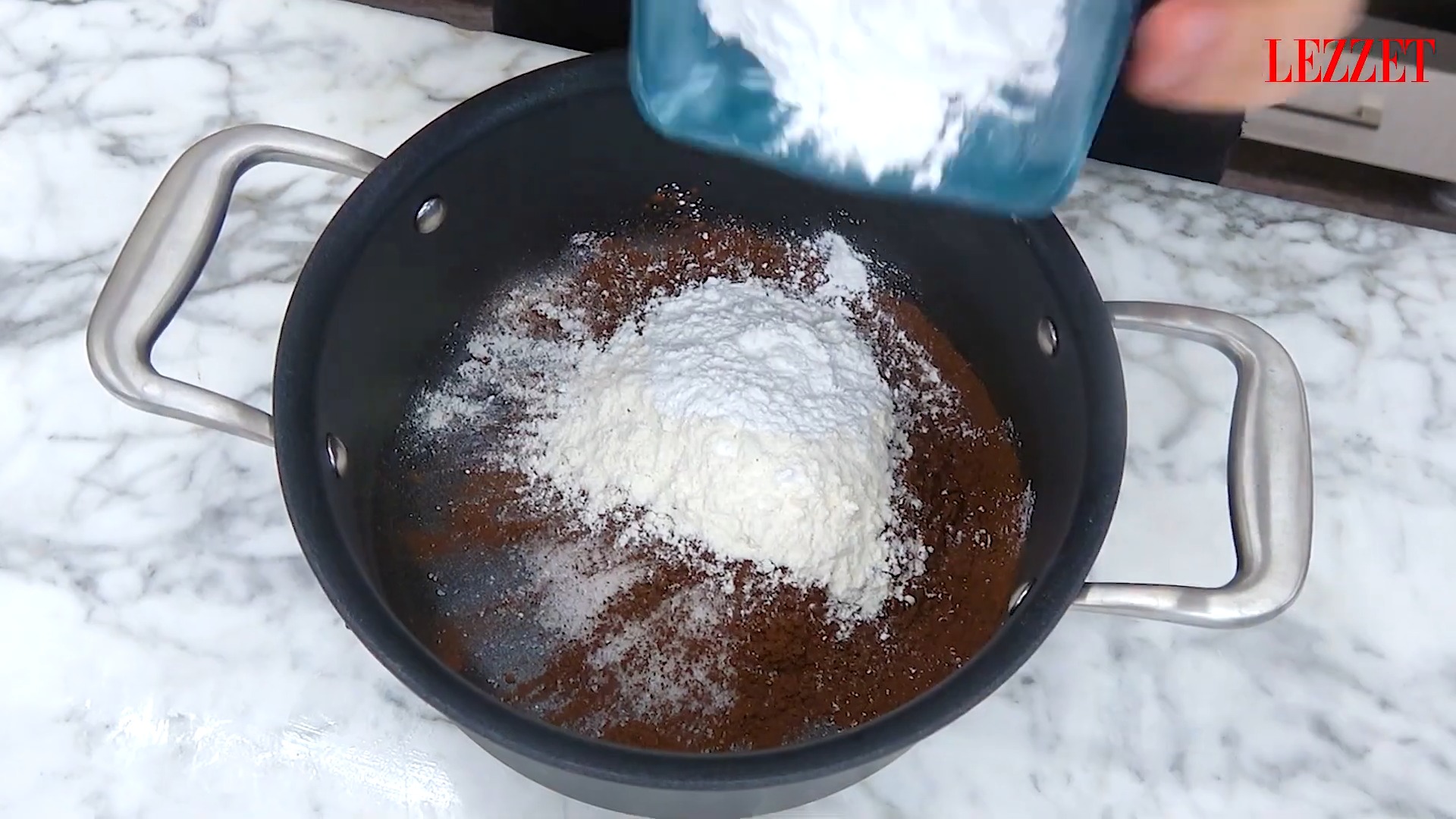 - Öncelikle kakao, un, nişasta ve şekeri bir tencerenin içerisine alın ve karıştırın.
