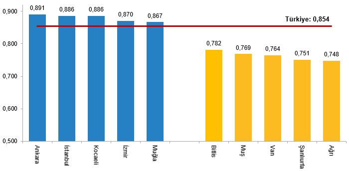 | İl Düzeyinde Beşeri Kalkınma Endeksi, 2018-2022 Bir ülkenin iktisadi kalkınma sürecinde, fiziki sermaye kadar beşeri sermaye yeterliliği de ehemmiyet arz etmektedir. Beşeri kalkınma endeksi de, bu minvalde, ülkelerin beşeri sermaye yeterliliklerinin tespit edilebilmesi amacı ile Birleşmiş Milletler Kalkınma Programı (UNDP) tarafından hesaplanmaktadır. Endeks; ömür beklentisi, eğitim ve gelir olmak üzere üç alt bileşenden oluşmaktadır. Beşeri kalkınma endeksi, 0 ile 1 ortasında bir paha almakta olup, endeksin 0,8 ve üzerinde olması “çok yüksek beşeri kalkınma” düzeyini, 0,7 ile 0,8 ortasında olması “yüksek beşeri kalkınma” düzeyini, 0,55’in altında olması ise ilgili ülkenin “düşük beşeri kalkınma” düzeyinde yer aldığını göstermektedir. Ülkemize ilişkin beşeri kalkınma endeks kıymetleri, günümüze kadar UNDP tarafından ülke seviyesinde üretilmekteydi. Ortalama eğitim mühleti ve mümkün eğitim mühleti göstergelerinin birinci sefer 2023 yılında Kurumumuz tarafından yayımlanması sayesinde, beşeri kalkınma endeksi ülkemiz tarafından üretilebilir hale gelmiştir. Kelam konusu endeks ulusal siyasetlere da taraf verebilmesi emeliyle birinci kere bu haber bülteni ile ülke düzeyinin yanı sıra vilayet düzeyinde de resmi istatistik olarak yayımlanmaktadır. Beşeri kalkınma endeksi 2022 yılında 0,854 oldu Beşeri kalkınma endeksi, 2018 yılında 0,844 iken 2022 yılında 2018’e nazaran %1,1 artarak 0,854 oldu. Bu bedele nazaran Türkiye, Birleşmiş Milletler Kalkınma Programı tarafından belirlenen sonlara nazaran “Çok Yüksek Gelişmişlik” düzeyindeki ülkeler kümesinde yer aldı. Bu endeksin alt bileşenleri olan ömür beklentisi endeksi 2022 yılında 2018’e nazaran %2,2 azalarak 0,882 olurken, eğitim endeksi ve gelir endeksi sırasıyla %3,0 ve %2,6 artışla 0,807 ve 0,875 oldu. Beşeri kalkınma endeksi ve alt endeksleri, 2018-2022 Beşeri kalkınma endeksi, alt endeksleri ve değişim oranları, 2018, 2022 Beşeri kalkınma endeksinin en yüksek olduğu vilayet Ankara oldu 2022 yılında vilayet seviyesinde en yüksek beşeri kalkınma endeksine sahip vilayet, 0,891 ile Ankara oldu. Bu ili, 0,886 ile İstanbul ve Kocaeli, 0,870 ile İzmir ve 0,867 ile Muğla izledi. Beşeri kalkınma endeksi en düşük olan vilayet 0,748 ile Ağrı olurken, bu ili Şanlıurfa, Van, Muş ve Bitlis izledi. Beşeri kalkınma endeksinin en yüksek ve en düşük olduğu 5 vilayet, 2022 İllere nazaran beşeri kalkınma endeksi, 2022 Beşeri kalkınma endeksinin son 5 yılda en çok arttığı vilayet %4,1 ile Kilis oldu Beşeri kalkınma endeksinin 2018-2022 yılları ortasında en çok artış gösterdiği birinci beş vilayet sırasıyla %4,1 ile Kilis, %4,0 ile Şırnak, %3,9 ile Çankırı ve Hakkâri ve %3,8 ile Ağrı oldu. Birebir periyotta, beşeri kalkınma endeksinin düşüş gösterdiği vilayetler sırasıyla %0,2 ile Trabzon, %0,1 ile Ordu, %0,03 ile Rize ve %0,02 ile Karabük oldu. İllere nazaran beşeri kalkınma endeksi değişimi, 2018, 2022 |