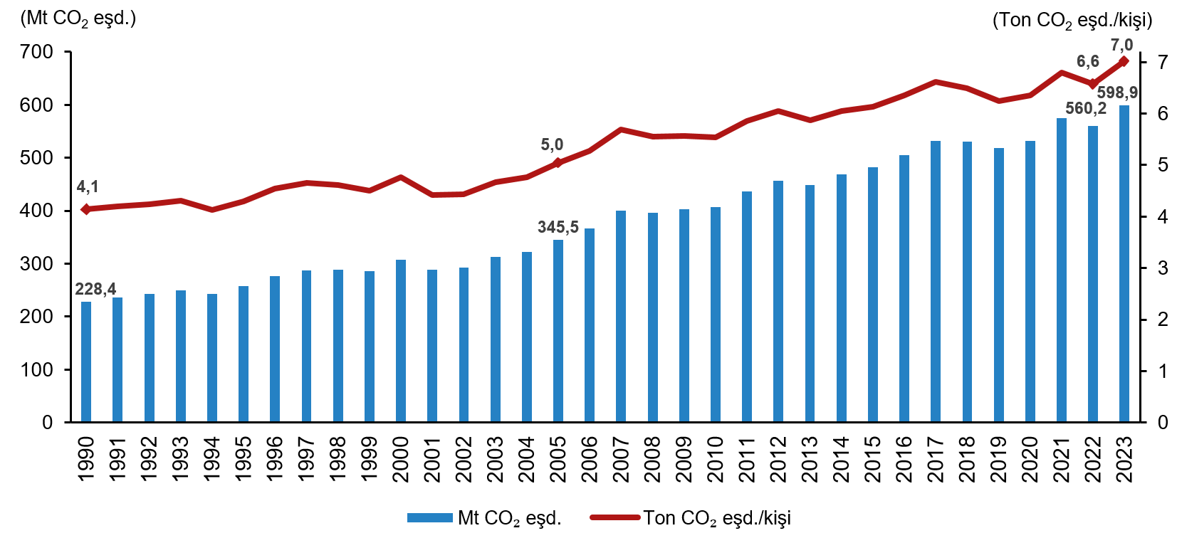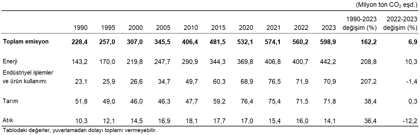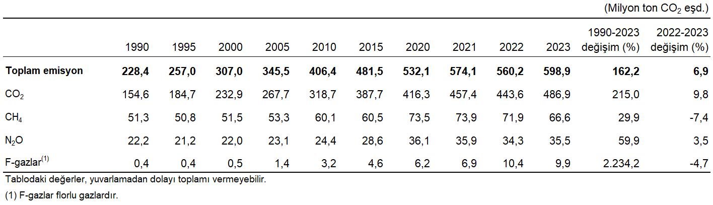 Sera gazı envanteri sonuçlarına nazaran, 2023 yılı toplam sera gazı emisyonu bir evvelki yıla nazaran %6,9 artarak 598,9 milyon ton (Mt) CO2 eşdeğeri (eşd.) olarak hesaplandı. Kişi başı toplam sera gazı emisyonu 1990 yılında 4,1 ton CO2 eşd., 2022 yılında 6,6 ton CO2 eşd. ve 2023 yılında 7,0 ton CO2 eşd. olarak hesaplandı.
