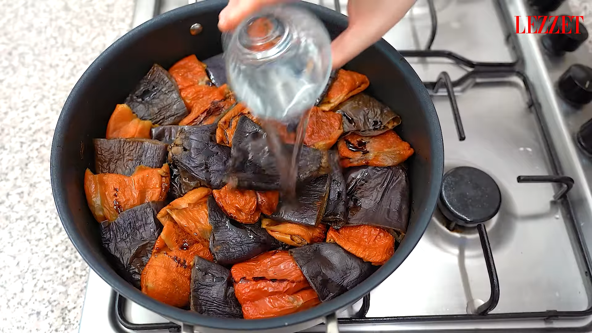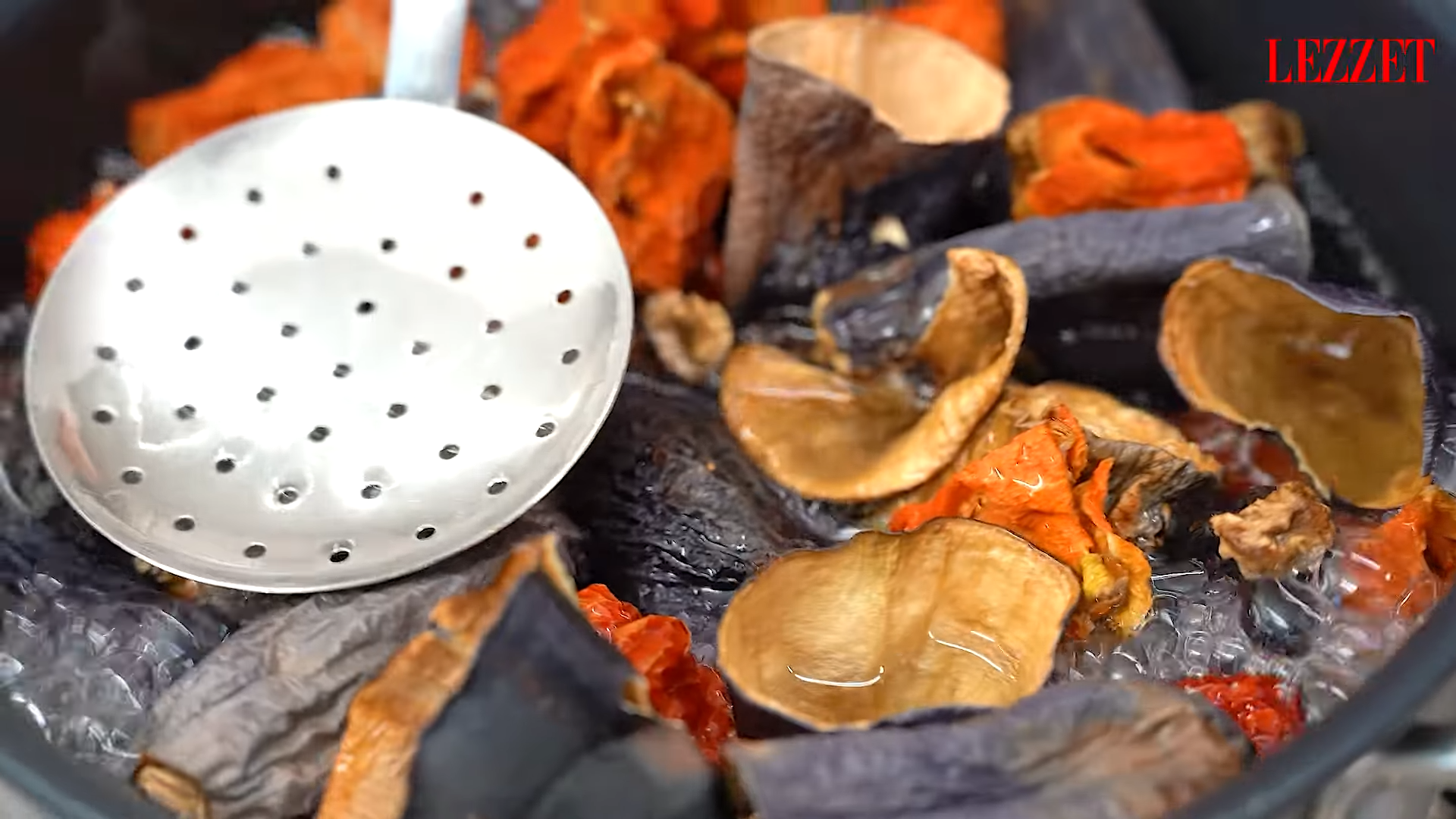 - Kuru patlıcan ve biberleri sıcak suya batırarak yumuşatın. 30 dakika kadar bekletin ve sonra suyunu süzün.