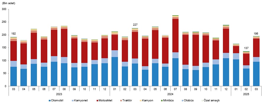Trafiğe kaydı yapılan taşıt sayısı, Mart 2023 – Mart 2025