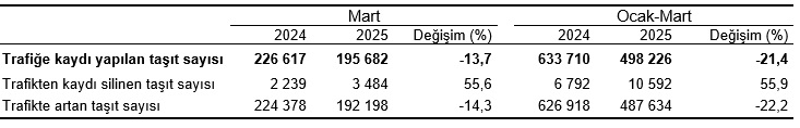 Ocak-Mart devrinde bir evvelki yılın birebir periyoduna nazaran trafiğe kaydı yapılan taşıt sayısı %21,4 azalarak 498 bin 226 adet olurken, trafikten kaydı silinen taşıt sayısı %55,9 artarak 10 bin 592 adet oldu. Böylelikle Ocak-Mart periyodunda trafikteki toplam taşıt sayısında 487 bin 634 adet artış gerçekleşti.