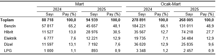 Trafiğe kaydı yapılan arabaların yakıt cinslerine nazaran dağılımı, Mart 2025